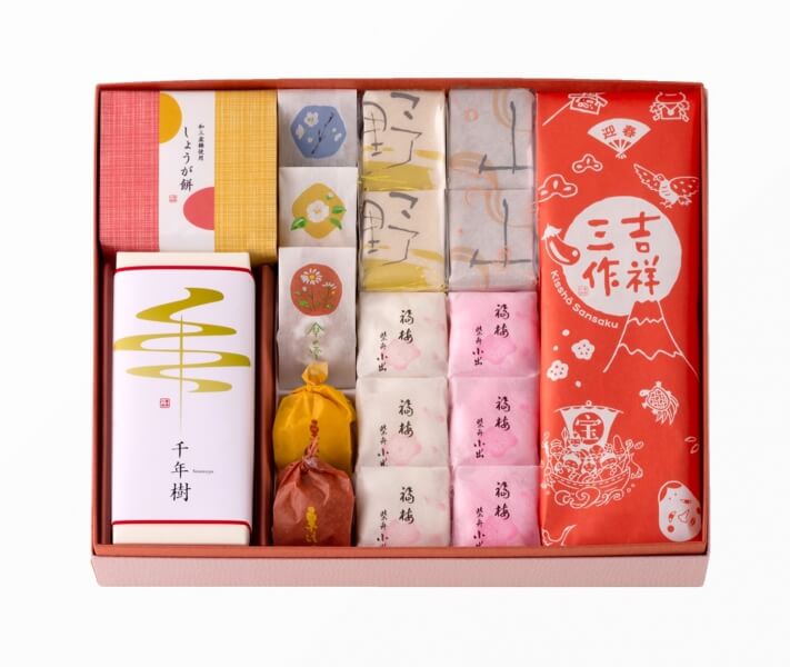 苔むす千年の大樹を表わしたその名もめでたい「千年樹」、金沢のお正月に欠かせない「福梅」、くるみを用いた木の実菓子の「不老仙菓」、初春の寿ぎをおいしさに重ねた詰合せです。